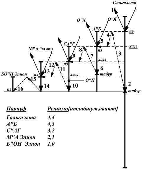 И снова на его табур воздействуют ор пними и ор макиф, убеждая получить весь свет, который есть в рош. И как в предыдущих случаях, парцуф решает избавиться от света, поскольку противостоять такому давлению у него нет сил, – масах поднимается от табура к пэ, изгоняя свет. В нем остаются решимот 2, 1, от которых образуется парцуф, называемый М"А Элион. А от решимот 1, 0, оставшихся от М"А Элион, появляется последний парцуф – БО"Н Элион.