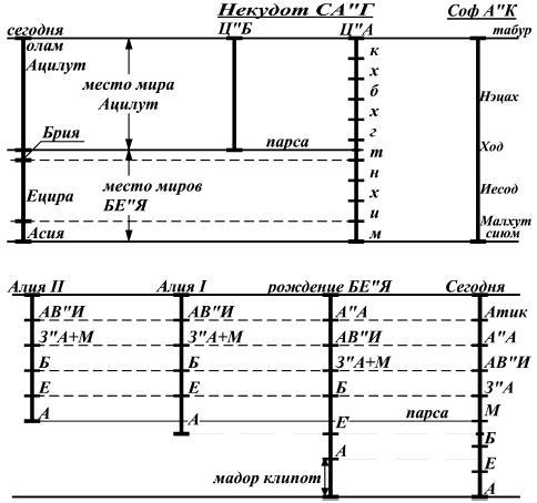 Этот подъем начинается еще в пятом часу в Йом аШиши, когда З"А поднимается на уровень А"А, и, соответственно, поднимаются все миры БЕ"А – это первый подъем. Второй подъем миров произошел в субботу вечером. Но вследствие грехопадения Адама миры БЕ"А спустились на свое теперешнее место. (см. чертеж ниже)