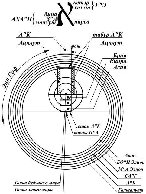 Олам Ацилут занимает место от табура А"К до парса. От парса до сиюма находится место расположения трех миров – Брия, Ецира, Асия. Это место появилось еще в момент, когда некудот СА"Г сделали Ц"Б.