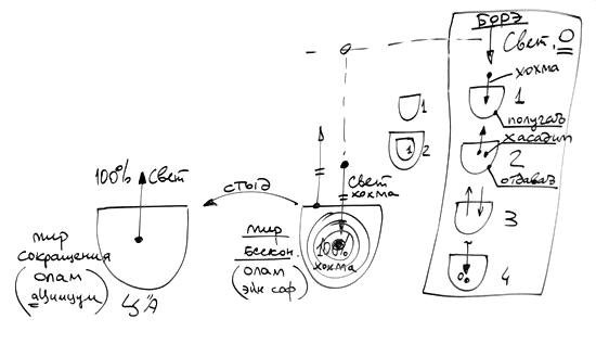То есть, все, что происходит под первой стадией, происходит внутри нее. А затем, что происходит с первой стадией? Она поднимается и сливается с нулевой. То есть все то, что есть – это свет и созданное Им кли, и больше нет ничего. Поэтому мы, хотя бы немножко, всегда будем касаться таких сторон нашего ощущения, десяти сфирот и так далее.