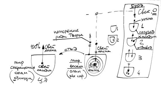 Все развитие миров, создание души Адама, нисхождение до нашего мира, создание нашего мира, затем начало подъема, то есть уже развитие снизу вверх неживой, растительной, животной, человеческой природы, и подъем человека снизу вверх – все эти действия, в общем-то, в потенциале, находятся внутри этих четырех стадий, заложены в них.