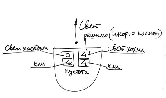 Итак, после Сокращения образовалась пустота от света Хохма, но внутри, естественно, есть свет Хасадим. После этого кли находится вот в таком состоянии: есть решимот от прошлого состояния, есть информация о настоящем состоянии, свет который ушел, то есть, Творец, который ощущается как Дающий наслаждение, как желающий дать.