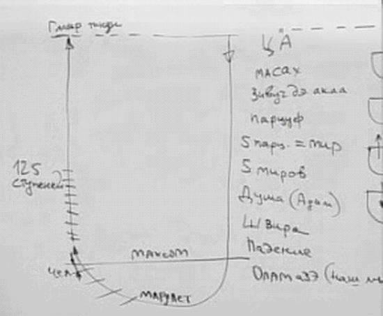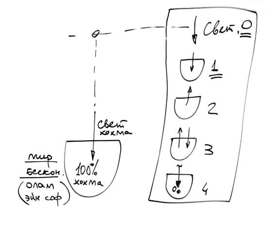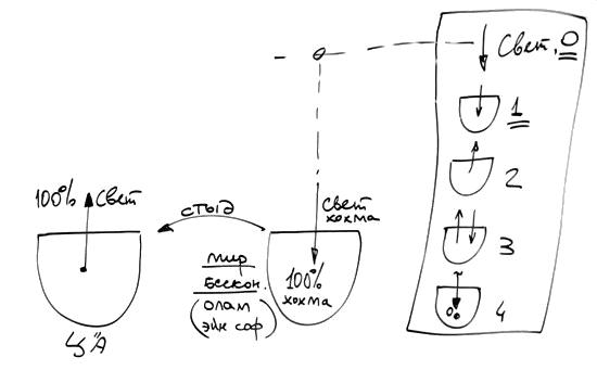 Этот процесс происходит сверху вниз. А затем происходит подъем из самого низкого состояния, называемого наш мир, ниже которого нет, он находится под условной перегородкой между духовным и нашим миром, называемой махсом. Вначале было падение, и затем – подъем. Духовное создает материальный мир, облачается в этот материальный мир, в течение миллионов, миллиардов лет происходит развитие, начиная с самого наинизшего уровня, с самого первого материального атома.
