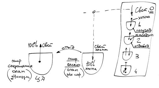 В итоге четвертая стадия делает Цимцум (Сокращение). Что значит Цимцум? Четвертая стадия, находится в состоянии, когда она полностью наполнена светом, стопроцентное наполнение светом в четвертой стадии называется Мир Бесконечности. Мир Бесконечности, на иврите называется "олам Эйн Соф" (олам – это мир, эйн – нет и соф – конец), мир без конца, мир Бесконечности.