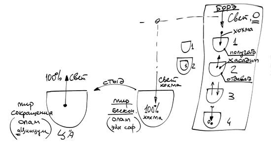 Это исходит из духовного корня, из правила, что ничто никуда не исчезает. Свет никуда из кли не ушел. То, что я здесь рисую, что как будто свет ушел, так он не ушел, просто было желание его ощущать, поэтому ощущалось, что он внутри. Сейчас есть желание не ощущать его, потому что я испытываю стыд, и поэтому этот свет не ощущается. Он может ощущаться бывшим когда-то у меня, если я нахожусь сейчас в таком состоянии, что не получаю, а раньше я знаю, что я получал и находился в состоянии получения. Вот эти два состояния я сейчас фиксирую – одно относительно другого, как прошлое относительно настоящего.