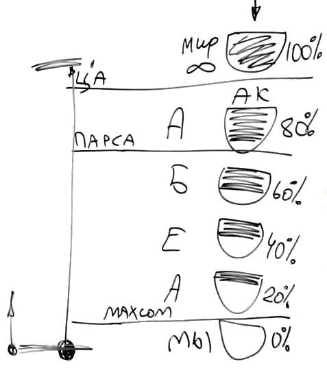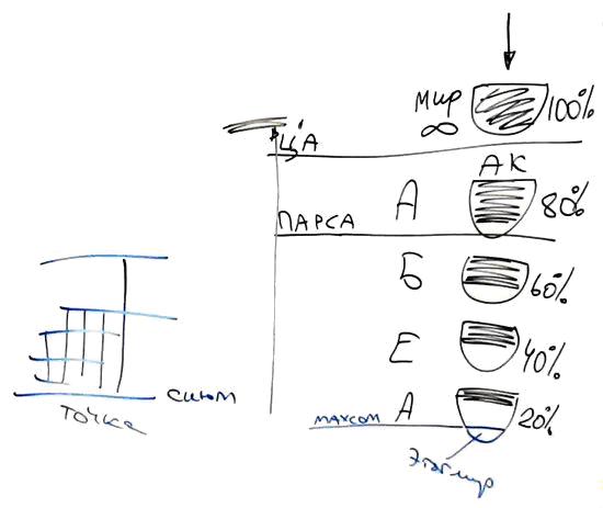 Когда свет полностью, на 100 % наполняет кли, – это мир Бесконечности. Затем он наполняет его, допустим, на 80, на 60, на 40, на 20 и на 0 процентов. Эти состояния называются мирами: Ацилут, Брия, Ецира, Асия и наш мир, мы. Между нами и миром Асия есть махсом. Между мирами Ацилут и Брия есть парса. Между миром Бесконечности (или, по-другому, Адам Кадмон) и миром Ацилут есть Цимцум Алеф. Наша задача – изнутри, из нашего самого плохого состояния достичь мира Бесконечности, сделать это, еще будучи в теле, в этом мире.