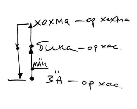 Между ними (между стадиями прямого света) произошло следующее: Бина, которая представляет собой ор Хасадим и бхину Бет (вторую стадию), родив Тиферет или З"А, бхину Гимел (третью стадию), снова соединилась с бхиной Хохма (первой стадией), для того чтобы попросить у нее ор Хохма и затем передать его З"А (третьей стадии), который состоит из ор Хасадим и небольшого свечения ор Хохма.