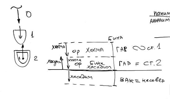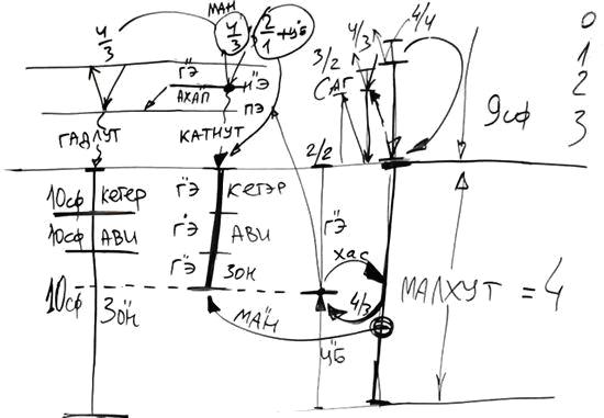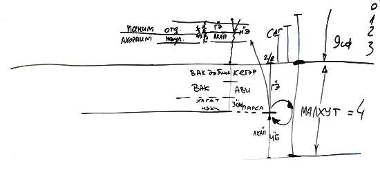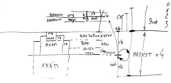 Итак, мы изучали Гальгальту, АБ, САГ, Некудот дэ-САГ, которые спустились вниз, смешались с НЕХИМ дэ-Гальгальта и образовали здесь Ц"Б, поднялись вверх, в Рош дэ-САГ, и из Рош дэ-САГ сделали зивуг дэ-акаа на Н"Э. Затем спустились света в то место, где они могут быть, – до Парса, образовав здесь три части: Кетер, АВИ и ЗОН.