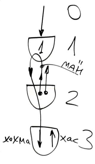 Итак, из нулевой стадии в первую стадию исходит свет, затем вторая стадия, которая не желает этого света, строит третью стадию, состоящую из света Хохма и света Хасадим.