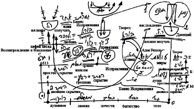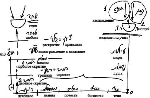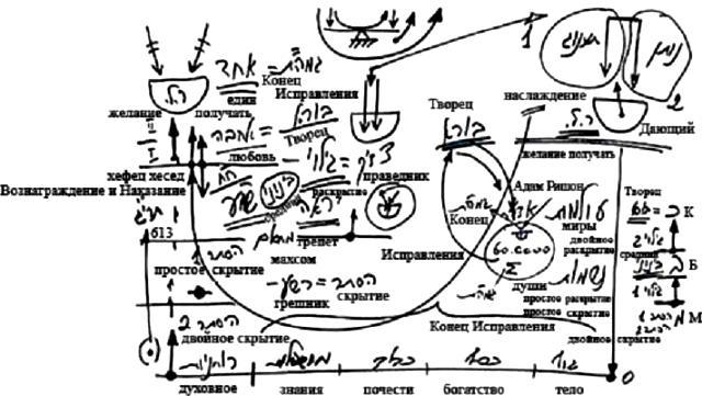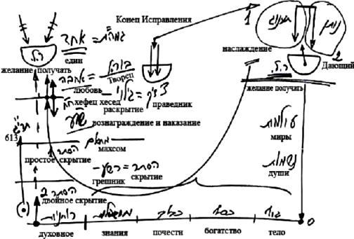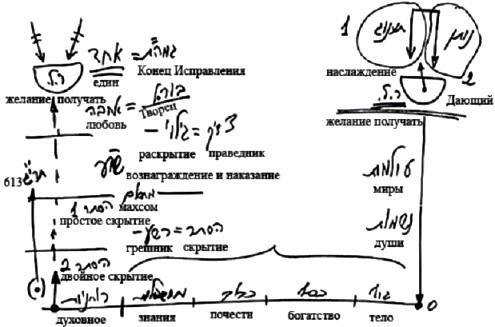 Именно в этих состояниях мы создаем наши келим. Впоследствии было бы невозможно подняться из миров БЕА в мир Ацилут (мир Ацилут это любовь) и исправить душу в мире Ацилут, если ты не подготовил злоумышления и оплошности в периодах простого и двойного скрытия, когда всеми силами хотел продвигаться, и все равно постоянно падал, пребывал в отчаянии и разочарованиях. И пока ты не прошел все эти вещи и не подготовил 613 своих пустых неисправленных желаний, у тебя не будет кли, с которым можно будет продолжать работать в периодах вознаграждения и наказания, а затем и любви.