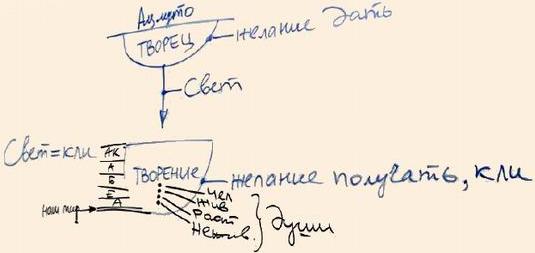 То есть, есть Ацмуто, о Нем мы совершенно не говорим, это нечто, что не может быть исследовано нами. Это Ацмуто относительно нас представляется как Творец. То есть, это желание дать. "Желание дать" Творца вызывает исходящий от Него к нам свет, который порождает, в свою очередь, творение – желание получать. Что получать и сколько получать? То, что свет строит под себя. То есть свет, естественно, равен, эквивалентен кли. Равенство это не качественное, а количественное.