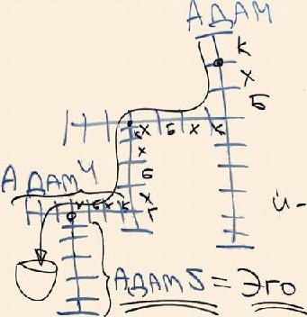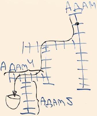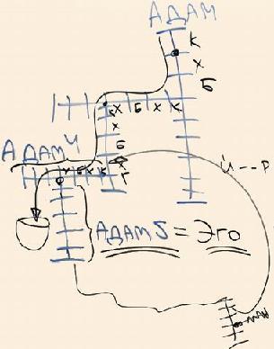 Значит, чем отличается, допустим, один человек от другого и от третьего? И все мы? По этой схеме получается так, что если я беру вот этого человека (я напишу его "Адам", не называя по именам), допустим, Адам №5, а здесь, допустим, Адам №4. Нам тут кажется, что Адам №5 как будто происходит от №4, мы не видим обратной связи. С одной стороны – Адам №5, этот парцуф произошел после парцуфа Адам №4, но с другой стороны – это неважно, что он произошел от него. Но этот Адам №4 не наполнится светом, если Адам №5 не наполнится светом. То есть, если у парцуфа Адам №5 будет кли, которое проведет к нему свет через все предыдущие парцуфим, и он будет наполняться – только в той мере предыдущие кли наполнятся, наполнится сам главный парцуф Адама.