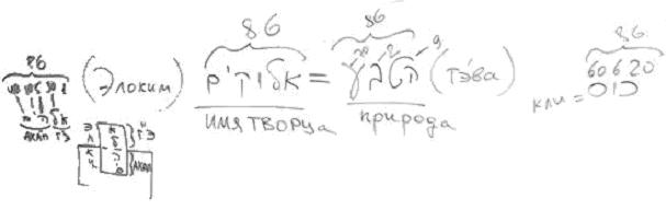 Поэтому природа и Элоким – они совершенно одинаковы. При подсчете букв в слове Элоким (см. рис. 2): «алеф» – это единица, «ламед» – это тридцать, «hэй» – пять, «юд» – десять и «мэм» – сорок, вы получите 86. Если мы подсчитаем буквы в слове тэва, получится также 86. Я на этом останавливаюсь потому, что это очень часто используется в разных статьях по Каббале. Слово «кос» (кли) – 60, 6 и 20 – тоже 86. То есть тэва, Творец и кли практически существуют один в другом и являются одинаковыми – или по своей мощи, или по своей противоположности, но абсолютно одинаковы, и по своему последнему, исправленному состоянию абсолютно идентичны. Иврит дает нам как бы возможность сравнения на уровнях использования символов.