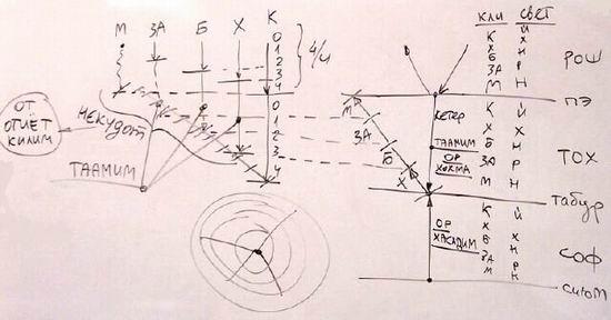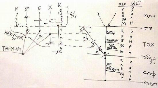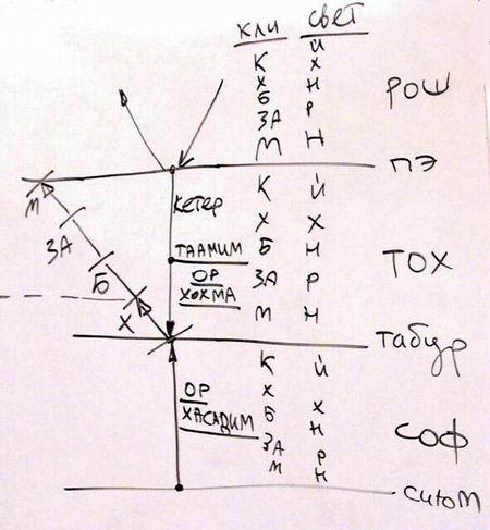 Так почему у некудот четыре света, ведь в тох вошло пять светов? Происходит "битуш пним у макиф" и исторжение света обратно. Мы говорим так: свет, который прошел в тох сверху вниз (таамим) - это комат кетер. А исторгаются хохма, бина, зеир-анпин, малхут.