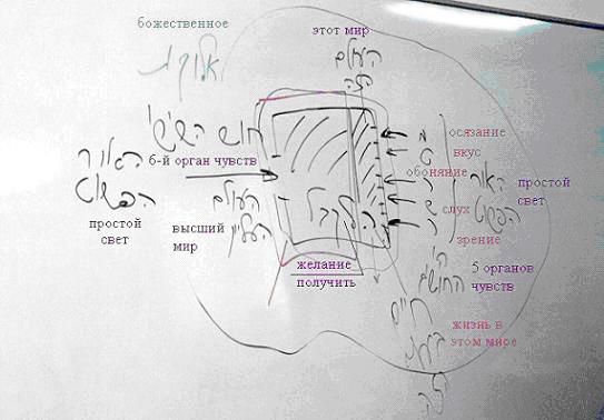 Kогда мы живем в этом мире, мы ощущаем через 5 обычных органов чувств. Если мы умираем и покидаем этот мир, то ощущаем через шестой орган чувств. А каббалисты особенны тем, что для них не важно: живут они в этом мире или умирают, задействуют ли они 5 органов чувств в этом мире или нет,- они могут использовать все органы чувств вместе.