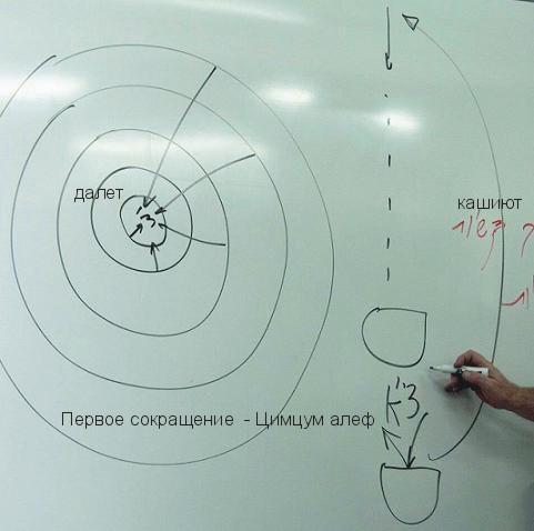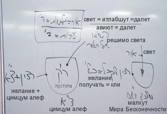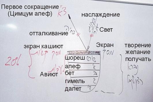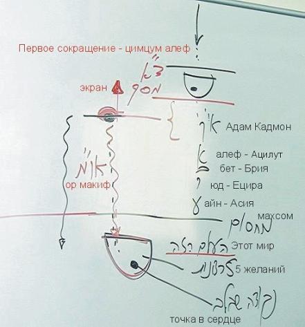 ...Мы изучаем духовные действия, происходящие при нисхождении творения от мира Бесконечности до этого мира. Первое действие, совершаемое малхут мира бесконечности, называется первое сокращение («цимцум алеф»). Затем малхут создаёт экран («масах»), после чего решает начать получать свет.