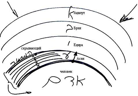 Что это значит? Все скрытия мира Асия находятся внутри человека, превращаются в раскрывающие экраны. Экраны, бывшие прежде скрывающими, обращаются в раскрывающие. Так человек поднимается над всеми мирами, пока не достигает мира Бесконечности.