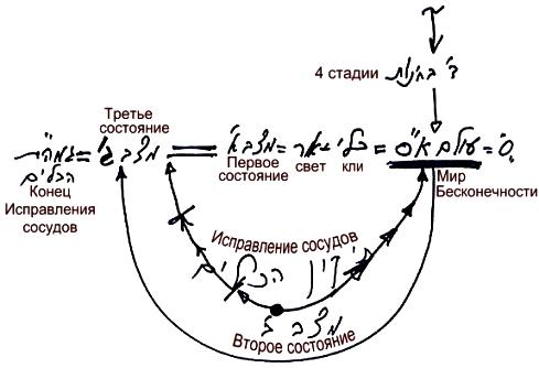 Через четыре стадии прямого света Творец создал мир Бесконечности или Малхут Бесконечности. Там – всё то кли и весь тот свет, которые должны раскрыться. Там, по сути, определяется всё будущее состояние. Мир Бесконечности – это первое состояние, а далее, через второе состояние, которое охватывает весь процесс нашего развития, мы приходим к третьему состоянию, к Концу Исправления. В сущности, мы возвращаемся к тому же состоянию, которое было в нашем корне, только не раскрывалось нам.