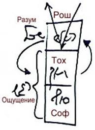 У нас есть парцуф, поделенный на три части: рош («голова»), тох («внутренность») и соф («окончание»). Тох и соф относятся к ощущению, а рош – к разуму. Кроме того, в «голове» тоже есть чувство, поскольку она обязана учитывать все свои келим, чтобы производить расчет на взаимодействие с высшим светом. А в «теле» тоже есть разум, потому что благодаря разуму оно понимает свои ощущения, и это позволяет ему в 620 раз сильнее осознать, с Кем оно поддерживает связь. Таким образом, разум усиливает ощущение.