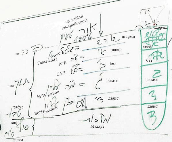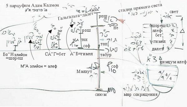 Всего пять парцуфим, каждый из которых малхут формирует в зависимости от степени своего авиюта (эгоизма): малхут, имеющая далет де-авиют, образует Гальгальту, гимел де-авиют – парцуф А"Б, бет де-авиют – Са"Г, алеф де-авиют – М"А, малхут с нулевым авиютом, соответствующим корневой стадии, формирует парцуф Бо"Н.