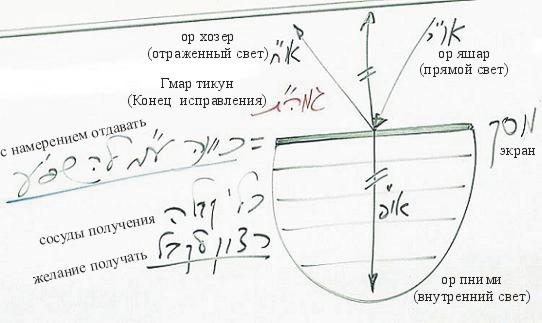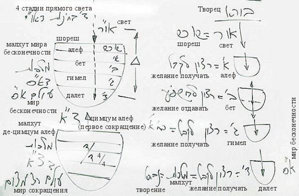 Вернемся к нашей теме: творение и исправление. Существует Творец, из которого исходит свет. Это нулевая стадия (бхинат шореш) и она создает первую (бхина алеф), являющуюся желанием получать. Бхина алеф, начав ощущать свет, в конце своего развития приходит к желанию отдавать и, перейдя во вторую стадию, задумывается над тем, что она может дать.