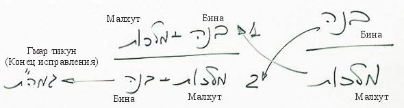 Поэтому сначала должно осуществиться действие по включению малхут в бину, а затем, когда бина уже будет знать, кто такая малхут, когда малхут присоединится к бине (бина+малхут) – тогда бина сможет присоединиться к малхут: малхут+бина –> Конечное Исправление.