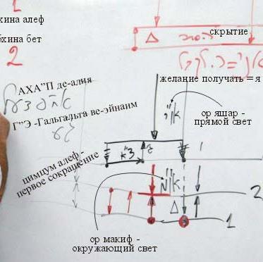 Когда человек поднимается снизу вверх? Мы не будем называть это «первым сокращением» - это я просто провел параллель между распространением сверху вниз и работой снизу вверх. Человек, совершающий над собой сокращение, входит в состояние «зародыша» («ибур»). Он становится «зародышем» («убар»). Начинает развивать масах с нулевым, корневым авиютом (авиют шореш). И отделяет себя от собственного желания получать. Это называется – прохождение махсома.