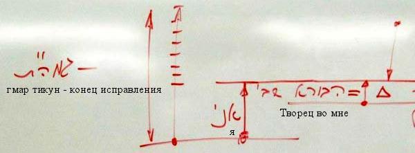 Предположим, вначале свет достигал некоей точки, а затем удалился, и мне необходимо заполнить образовавшуюся пустоту. Для этого есть свойства Творца (правая линия), о раскрытии которых я прошу, свойства творения (левая линия), а я – создаю среднюю линию. Каким образом я её строю?