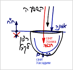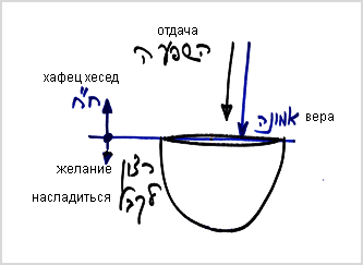 Мы говорим, что человек, прежде всего, должен приобрести свойство отдачи. Что значит свойство отдачи? Это значит не думать о том, что находится в моем «кувшине», не думать о желании получать. И хотя человек получает то, что он обязан получать, но для него это является неважным и называется насущным, обязательным для существования. А весь он сосредоточен на намерении выше себя, что называется хафец хесед. Что такое хафец хесед? – Ничего не хочет для себя, т.е. нейтрализует желание получать с помощью поступающего к нему света и приобретает свойство веры.