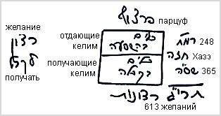 Что это значит? Как мы уже говорили, в человеке есть желания – желания получать наслаждения. Эти желания выстраиваются в нас в форме парцуфа. Парцуфом называется собрание желаний, связанных между собой подобно органам физического тела. Парцуф делится на две части. До границы, которая называется хазэ, находятся отдающие келим, а от хазэ и вниз – получающие келим. Всего есть 248 (РАМАХ) отдающих келим и 365 (ШАСА) получающих. В общем счете душа состоит из 613 желаний.