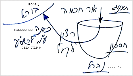 Для того чтобы исправить творение, дать ему возможность использовать желание получать с намерением отдачи, необходим «свет, возвращающий к Источнику». И если творение, скажем, человек в этом мире, учится, выполняет все советы каббалистов и привлекает Окружающий свет свыше, то благодаря воздействию этого света поднимает свое кли, т.е. все желания получения и отдачи, смешанные вместе, на уровень, который называется получать с намерением отдачи. Таково исправление.