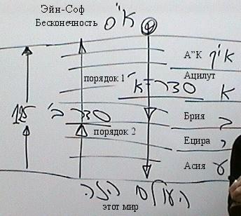 Сверху вниз - мир Бесконечности, затем Адам Кадмон, Ацилут, Брия, Ецира, Асия, этот мир. И в каждом мире есть пять парцуфим, в каждом парцуфе - пять сфирот – всего получается 125 ступеней подъема снизу вверх, которые установлены нисхождением света сверху вниз.