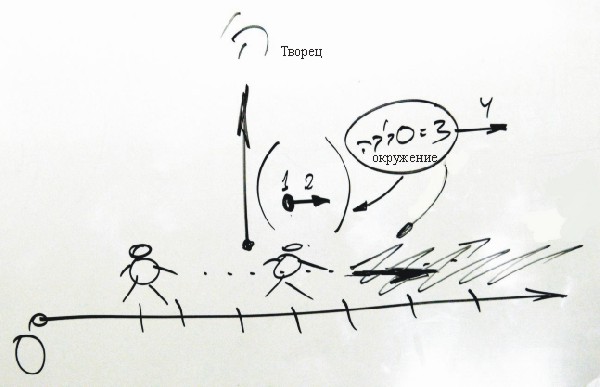 То же желание получать, что открывается во мне, должно быть желанием получать всех творений, и так в каждом из нас. Сейчас я - это только точка, только мое маленькое решимо. Для того, чтобы достичь уровня Творца... Я нахожусь тут (рисует).