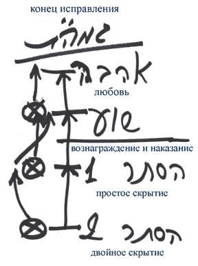 Мы знаем, что человек поднимается от двойного скрытия к одиночному скрытию, затем от одиночного скрытия к вознаграждению и наказанию, а от вознаграждения и наказания к любви – существуют четыре ступени, по которым поднимается человек. Сначала он проходит период двойного скрытия, затем одиночного скрытия, махсом, период вознаграждения и наказания и приходит к любви.