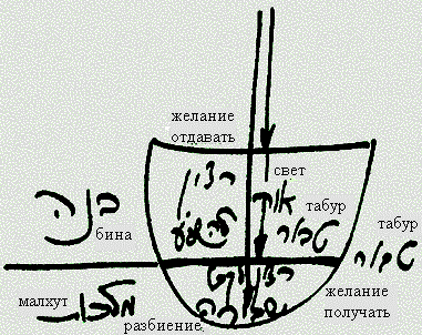 Здесь выполняется некое особое действие: когда этим келим, находящимся под табуром, кажется, что они способны получить свет ради отдачи, поэтому свет входит внутрь. И когда свет входит внутрь, происходит разбиение. Что такое разбиение? Это значит, что все келим перемешались между собой.