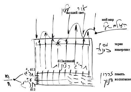И в той мере, в которой желание получать строит на себя экран, по отношению к желаниям, скажем, на 613 желаний. Здесь, внизу на рисунке, есть у меня 613 желаний, и на каждое из желаний есть у меня экран, намерение. А желания есть большие и есть меньшие, есть еще большие и маленькие, и есть совсем маленькие и т.д. И та картина, которую я строю на основе этих желаний, когда сверху на меня давит Высший свет, так та картина, которую здесь я вижу, - это мой мир. Т.е. все, что вижу перед собой - это, в сущности, реакция от внутренних исправлений, 613-ти исправлений 613-ти желаний.