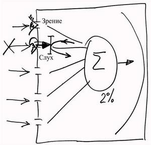 Кроме того, я знаю, что живые организмы с отличными от моих органами чувств ощущают эту картину иначе. Собака воспринимает набор запахов, змея – тепловое излучение, некоторые животные руководствуются лишь слухом, и т.д. Сам я воспринимаю мир как сочетание реакций в собственных органах чувств. Причем совокупность получаемых ощущений мой мозг обрабатывает, задействуя лишь два процента своей производительности. Остальными 98-ю процентами я не пользуюсь.