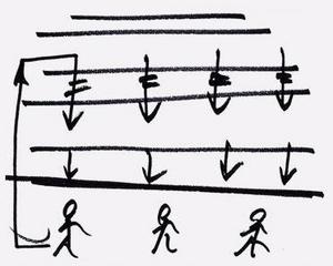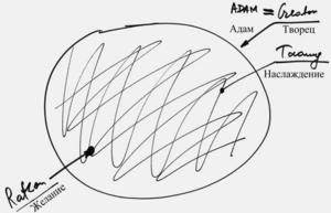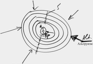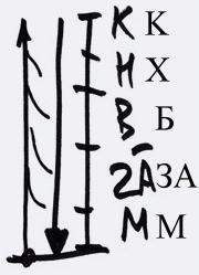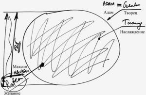 Большая потребность в духовном называется, например, «фараоном». Неважно, как именно ее определять. Человек всё учится и учится, время всё идет и идет, и он видит, что «минус» только увеличивается. Он как будто бы не продвигается, ведь продвижение представляется ему самонаполнением. Вроде бы, по ходу дела он должен обзаводиться всё большим имуществом, всё больше понимать и ощущать, а тут происходит наоборот: чем дальше он продвигается от ступени к ступени (стрелки слева), тем меньше понимает и меньше ощущает. Чувства его затуманены, разум не понимает происходящего, человек запутан и опустошен.