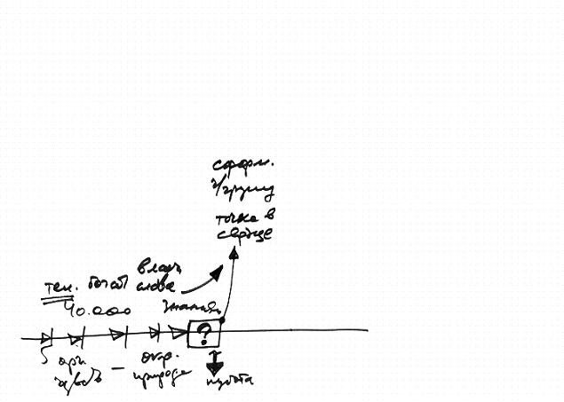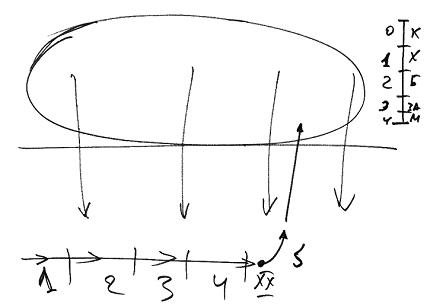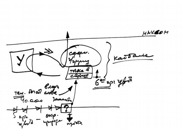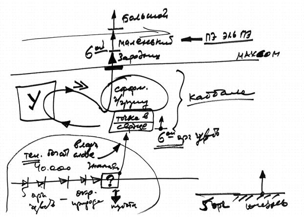 Если человек является (см. Рис. 6) каким-то элементом в общей системе шестого измерения (я говорю «шестое измерение», потому что «шестой орган чувств»), он постоянно возвращается в наш мир и снова поднимается, то есть постоянно оказывается в пяти органах чувств и снова уходит из них.
