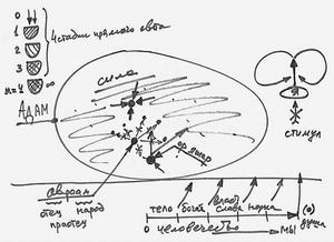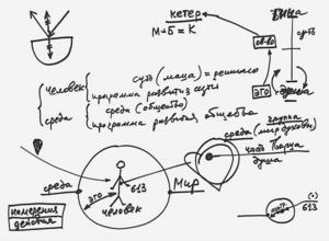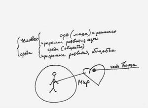 Дело в том, что сам путь строится человеком. Задать его извне невозможно. Можно лишь привести человека в первоначальное состояние: возбудить точку в сердце и построить вокруг точки в сердце все необходимое, ее среду (см. Рис. 3). Если у нас есть человек и окружающая его среда, мы имеем мир, а если есть точка в сердце (назовем ее душой) и есть окружающая душу среда, мы тоже имеем мир, только духовный.