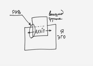 Как мы продвигаемся? Есть высшая ступень и низшая ступень (см. Рис.18). Низшую ступень я нарисовал побольше, потому что это более эгоистическая ступень. Высшая ступень – это мое будущее состояние, я должен найти с ним контакт. Он находится во мне своим АХАПом, он готов мне помочь, но я должен найти с ним контакт. Вот это высший – это и есть группа. Нет у нас ничего большего.