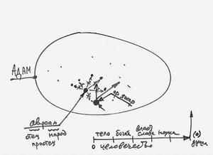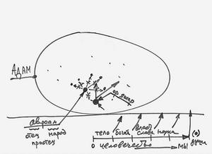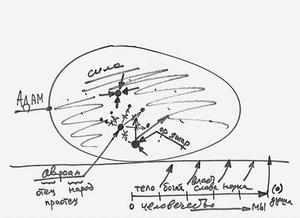 О чем говорят книги? Они как раз и говорят о состоянии (Рис. 10, Адам), в котором мы с вами и сегодня находимся, которое от нас скрыто, и которое мы должны раскрыть, выявить этот образ вечного существования, сделать так, чтобы он проступил сквозь оболочку этого мира. Каббалистические книги говорят только о том, как мы между собой взаимодействуем во всей этой системе; они говорят, что это система в том виде, в каком она была создана, называется миром Бесконечности, и рассказывают, каким образом я приближаюсь к раскрытию для себя этой системы.