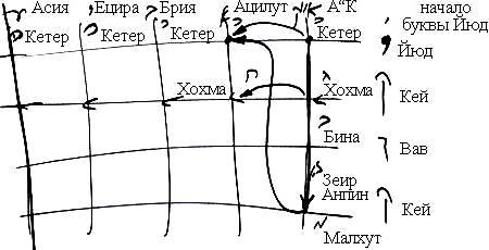 Есть «начальная точка буквы юд», юд, кей, вав, кей. Впоследствии все творение делится на миры АК, Ацилут, Брия, Ецира и Асия. И тогда в каждом из этих миров от «начальной точки буквы юд» есть Кетер, от юд – Хохма, от первой кей – Бина, от вав – ЗА и от последней кей – Малхут. Все они связаны между собой и передают света один другому. Но как они передают их друг другу? Как может «начальная точка буквы юд» - Кетер АК передать свет Кетеру мира Ацилут? Это можно сделать только через АВАЯ, находящуюся между ними, то есть, свет должен пройти через весь мир АК, и, достигнув самого низа, вернуться Отраженным светом и прийти наверх, к Кетеру мира Ацилут. И то же самое – относительно остальных сфирот.