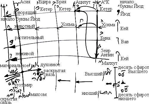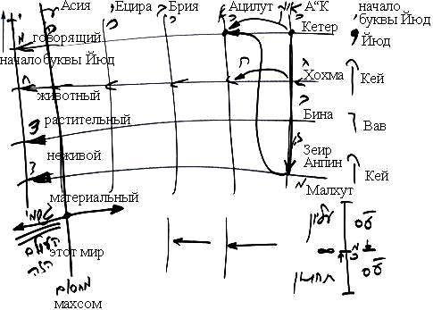 Этот материальный уровень тоже подразделяется на неживой, растительный, животный, человеческий и «начальную точку буквы юд» - корень всего, который вроде бы должен получать также от духовных миров, заканчивающихся перед махсомом, отделяющим духовные миры от материального, от этого мира.