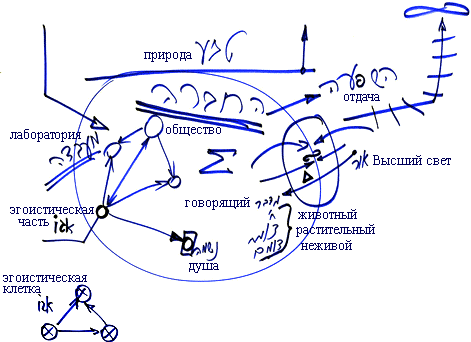 Достигая здесь, в нашем обществе равновесия с природой, мы приходим к равновесию с Творцом. Мы строим внутри общества систему сообразно Его разуму. Мы в человеческом обществе, словно в лаборатории.