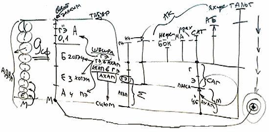 Итак, от Табура вниз произошла швира. В результате разбиения Г''Э и АХАПа из возможных перестановок получается всего четыре варианта, которые мы можем выделить из всей этой системы разбитых и перемешанных между собой келим: Г''Э, Г''Э в АХАПе, АХАП в Г''Э и АХАП.