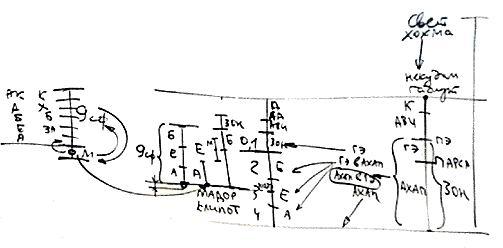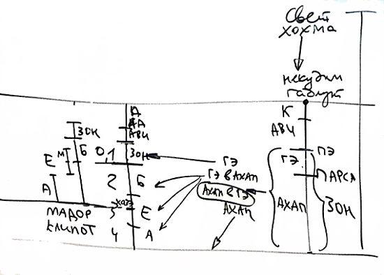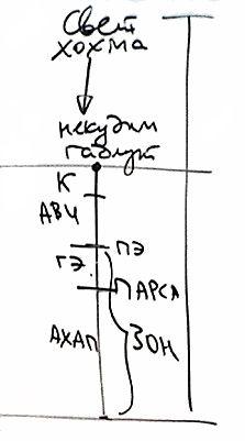 Сейчас мы рассмотрим, как это получается. Наше исправление приводит в ЗОН к связи между З"А и Нуква (это как мужская и женская части). Они соединяются между собой, порождается желание родить что-то новое. Это желание поднимается к ИШСУТ, ИШСУТ возбуждает АВ"И, Аба вэ-Има (это тоже как бы мужская и женская часть) соединяются между собой, выдают вниз свет на ИШСУТ и он проходит обратно на ЗОН и затем уже вниз. И вот та неисправленная душа, где есть какое-то решимо де-итлабшут и решимо дэ-авиют, получая свет, образовывает экран и уже с помощью экрана начинает двигаться дальше. Вот это вся система.