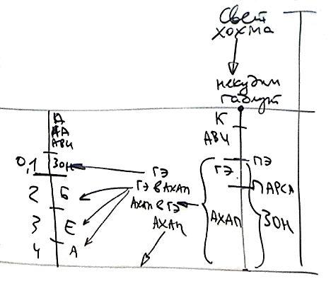 Далее, Гальгальта вэ-Эйнаим в АХАП – это миры Брия, Ецира, Асия, от них образовывается Гальгальта вэ-Эйнаим в АХАП. И АХАП в Гальгальта вэ-Эйнаим – это та часть от АХАП. от лев а-эвен, которую мы можем поднять и соединить с Гальгальта вэ-Эйнаим, и которая сможет работать как Гальгальта вэ-Эйнаим, уподобиться ей, то есть прибавить в эти миры, в эти Гальгальта вэ-Эйнаим, авиют 0,1,2,3,4. Это авиюты Гальгальта вэ-Эйнаим, которые здесь находятся. Прибавить сюда еще свой АХАП, который тоже как бы добавляется к этой Гальгальта вэ-Эйнаим.