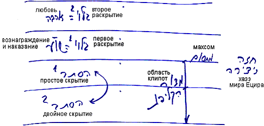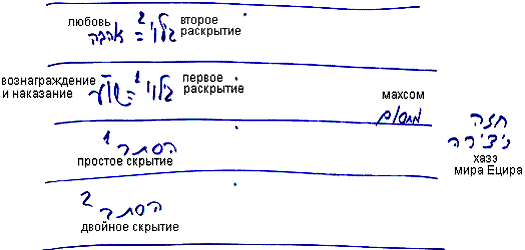 В двойном скрытии человек обретает некоторую покорность, в простом – отделяет тьму от света, затем переходит уже к самому исправлению в первом раскрытии, а потом, во втором раскрытии – к чистой отдаче.