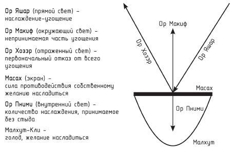 Рассмотрим структуру творения (Рис.1), которое создалось в четвертой стадии. Свет, выходящий из Творца, называется прямым (ор яшар), свет, который отталкивает малхут, называется отраженным (ор хозер), свет, частично входящий в сосуд, называется внутренним (ор пними).